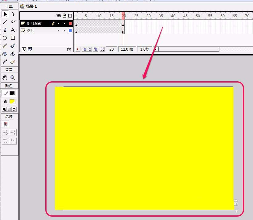 6、在“图片”图层第20帧插入普通帧;在“矩形遮蔽”图层第20帧插入关键帧。