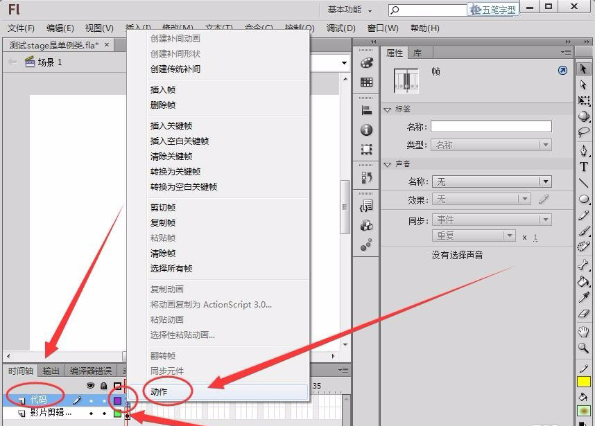 6、新建一个代码图层,在图层的第1帧右击,选择“动作”选项。