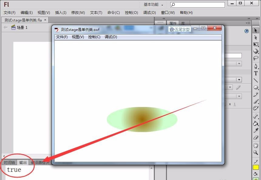8、运行程序,在输出窗口输出的值是true,说明主时间轴和影片剪辑元件椭圆引用的是同一个实例,即舞台stage类是唯一的,stage类得确是单例模式类。