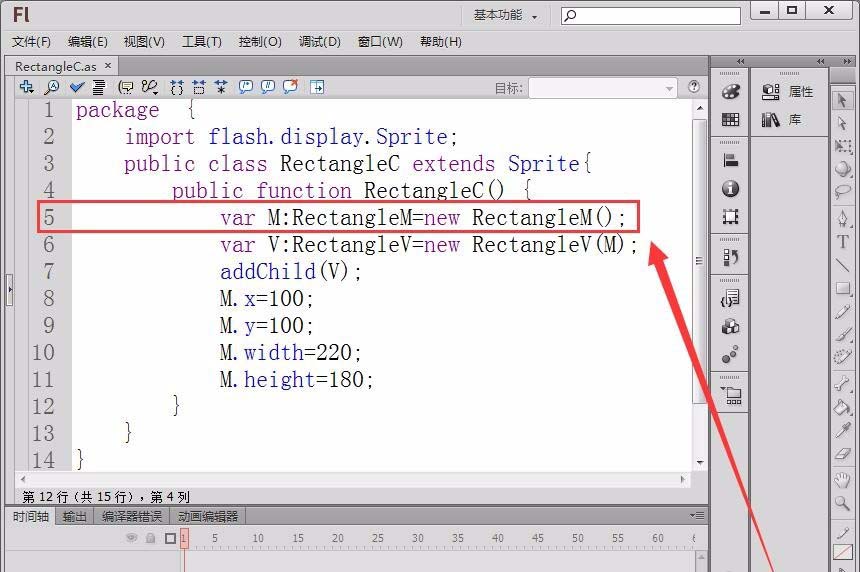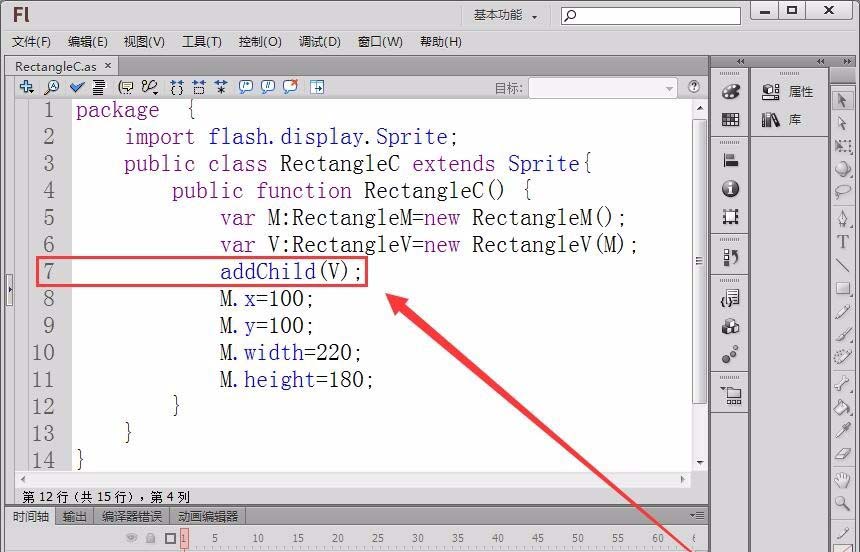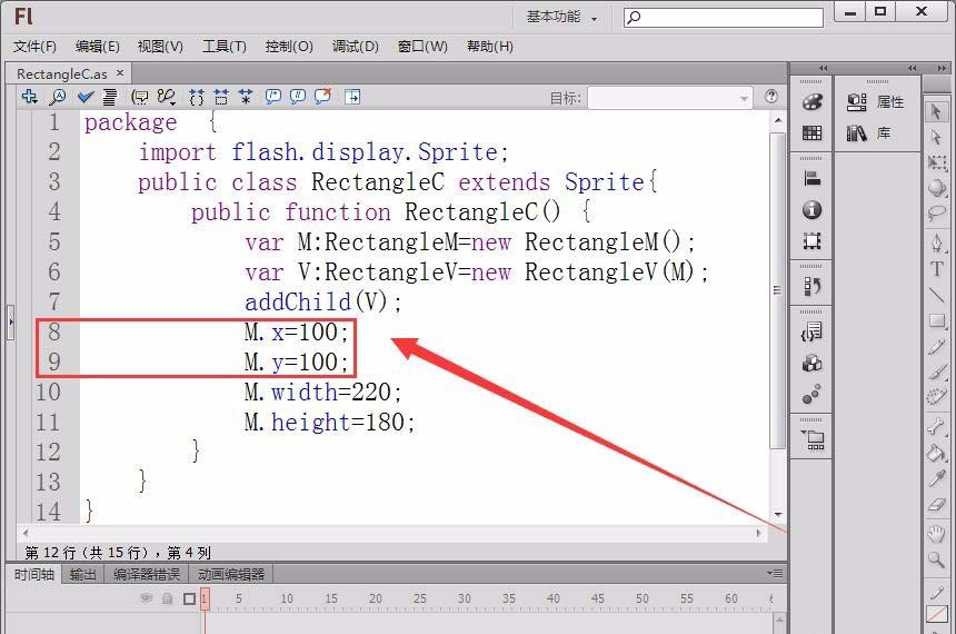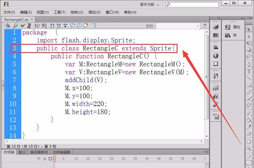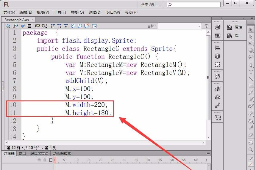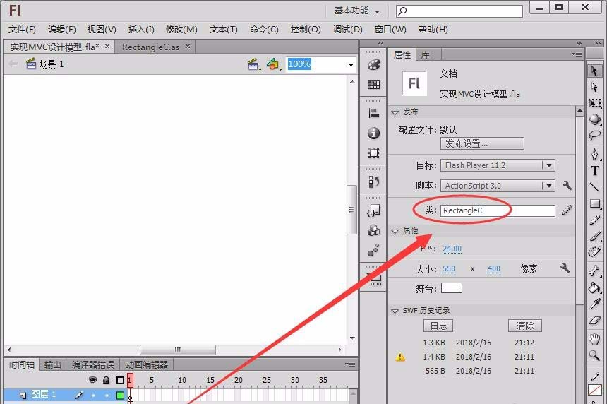11、新建一个Flash文档,在属性面板中输入控制器RectangleC类。