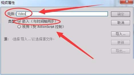 1、打开“视频属性”对话框后,在“元件”栏中输入视频的名称,“类型”选择为“嵌入”。