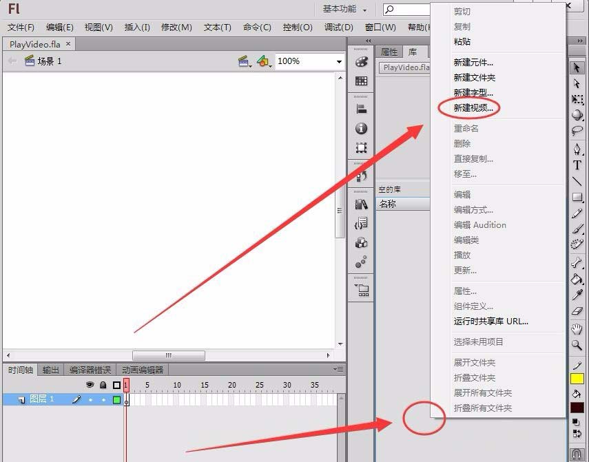 方法二:在库面板的空白区域右击,选择“新建视频”。