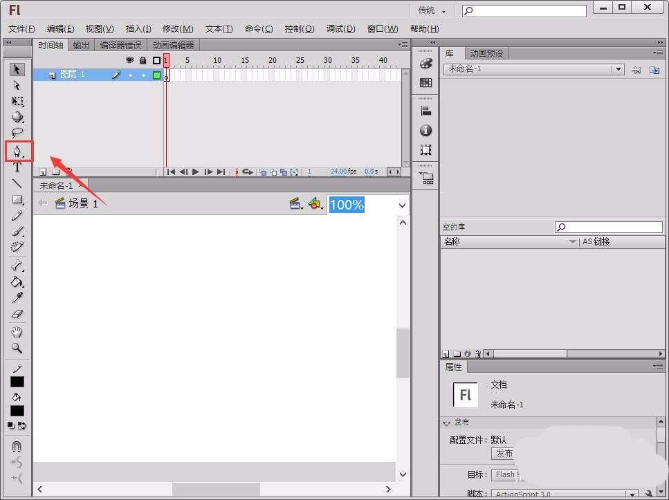 1、我们双击桌面上flash的快捷图标,将该软件打开,打开flash之后在其操作界面内找到钢笔工具,如图所示: