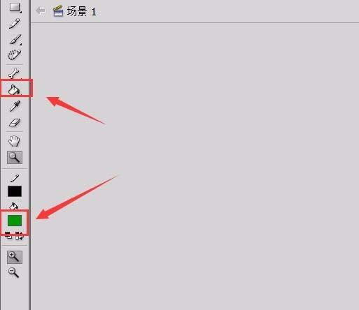 6、绘制好叶子之后在工具箱内找到颜料桶工具,并设置填充色为绿色如图所示: