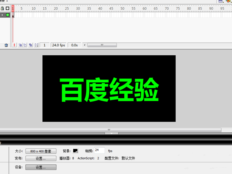 1、首先启动flash8,新建一文档,大小为800*400,帧频为24fps,背景颜色为黑色。