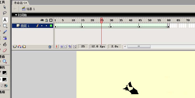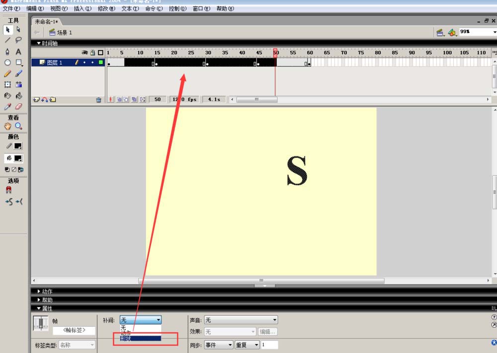 5、在所有的关键帧之后,创建一个形状补间动画。直接在帧属性面板中将补间改成形状即可。