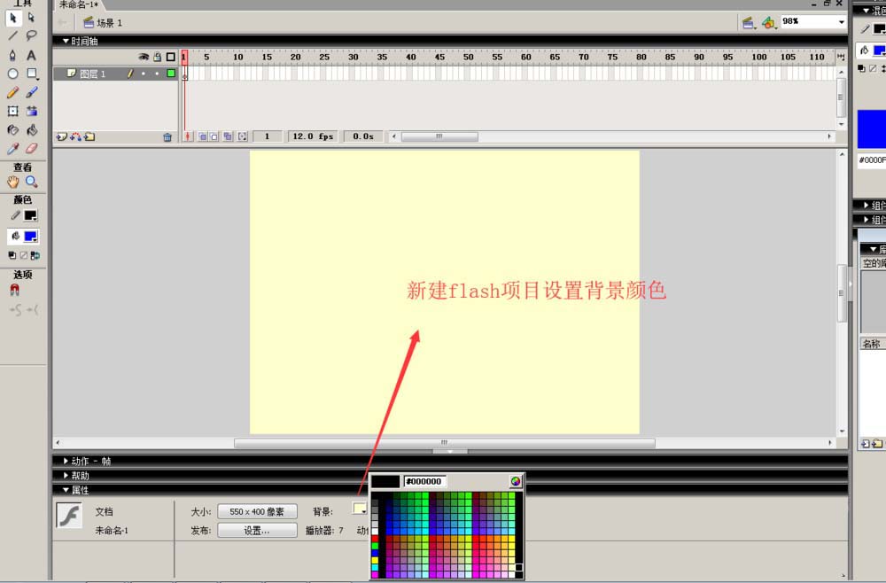 1、打开flash软件新建一个flash项目,并设置好这个项目舞台的背景颜色等一些属性。