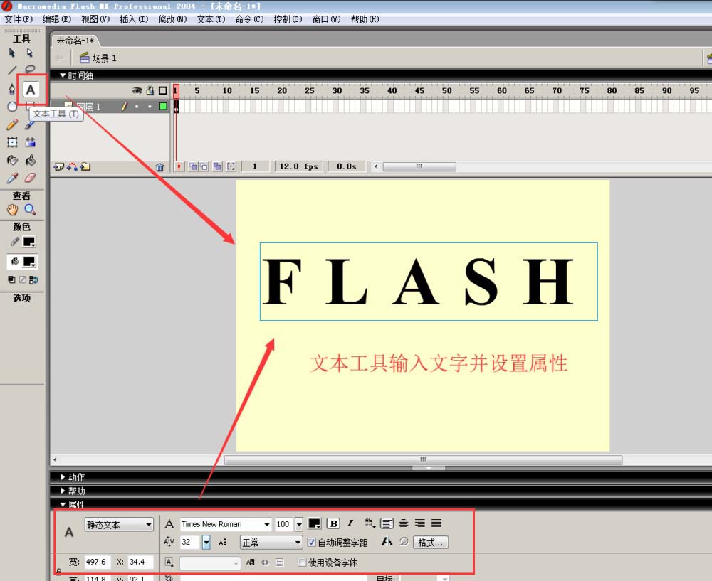 2、使用文本工具在舞台位置单击输入文字内容,在用选择工具单击选中文字在属性面板中调整文字的属性参数。