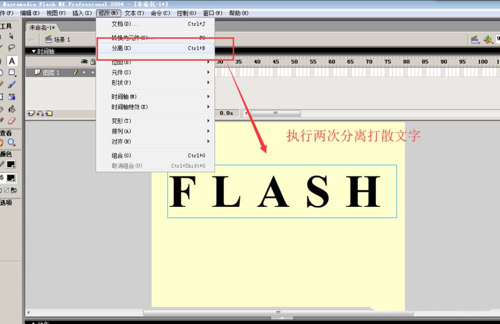 3、鼠标左键单击选中文字,执行修改菜单栏中的分离命令,注意这里要对文字执行两次分离命令。
