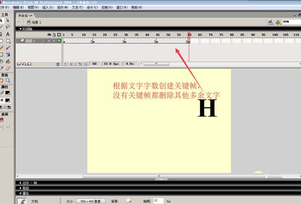 4、确定每个文字变形出现的时间帧长度,然后根据文字字数插入对应的关键帧,并在每个关键帧上将多余的文字选中按delete键删除。