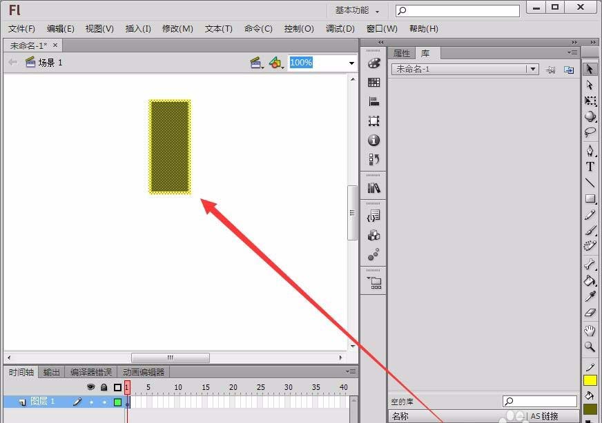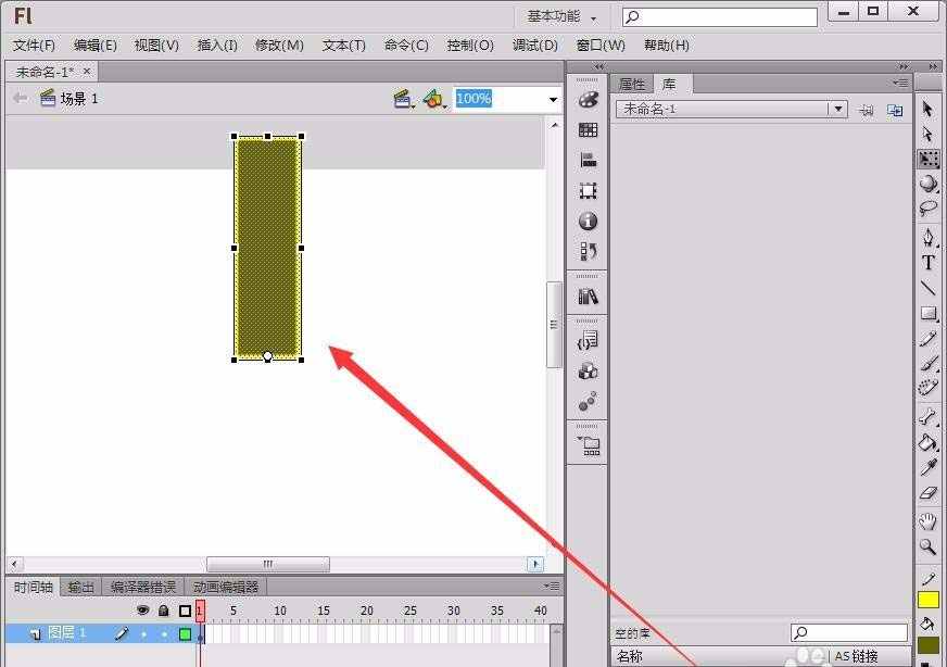 1、选择“编辑栏”中的“矩形工具”,设置线条色和填充色,在舞台中绘制一个长方形。