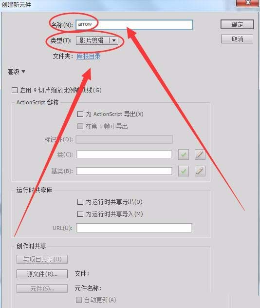 1、单击“插入”---->“新建元件”,将元件“名称”取名为arrow,“类型”为影片剪辑,在库面板中新建一个绘有箭头的影片剪辑元件。