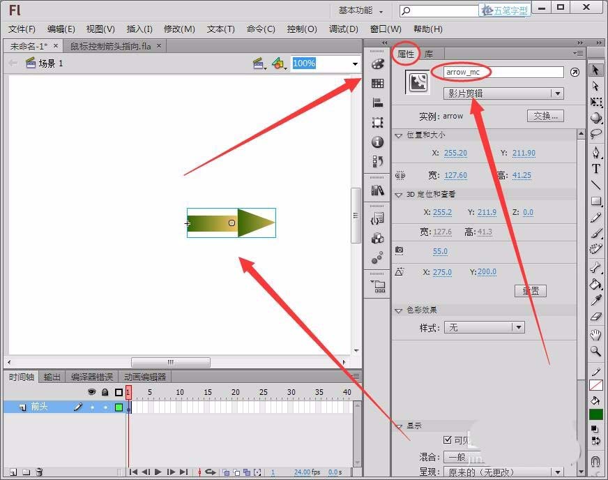 2、回到场景1,将库面板中的影片剪辑元件arrow拖动到舞台中,在“属性”面板中,将实例名称取名为“arrow_mc”。