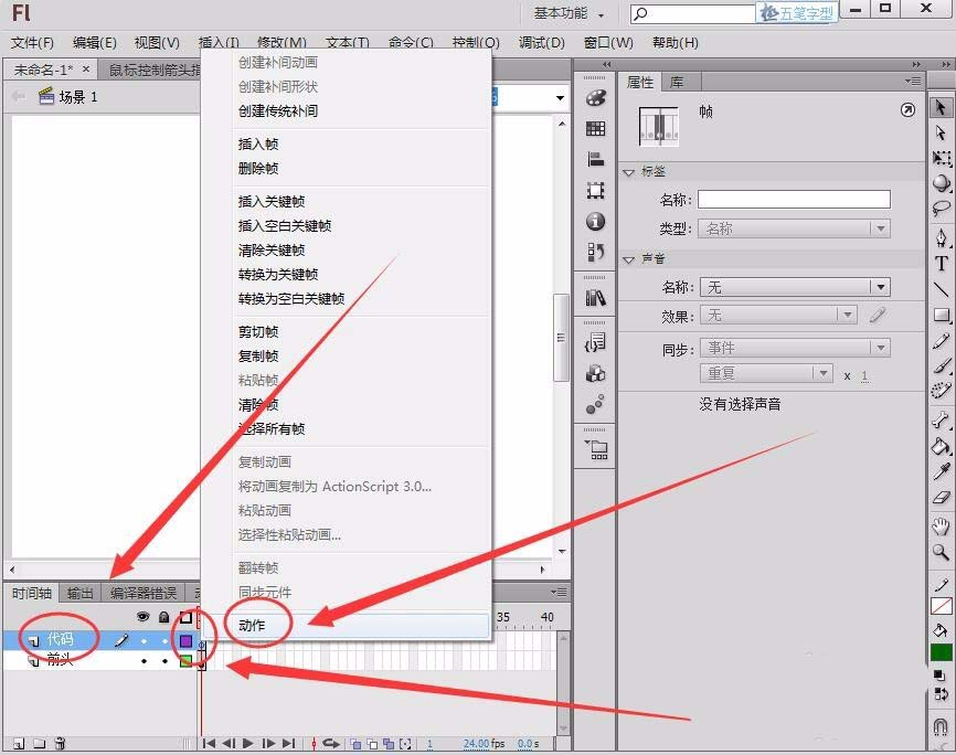 3、新建一个图层命名为“代码”,在图层的第1帧右击,选择“动作”选项。