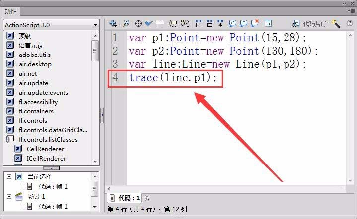 8、回到Flash文件中,将最后一句代码稍加修改,用方法p1来访问私有变更_p1。