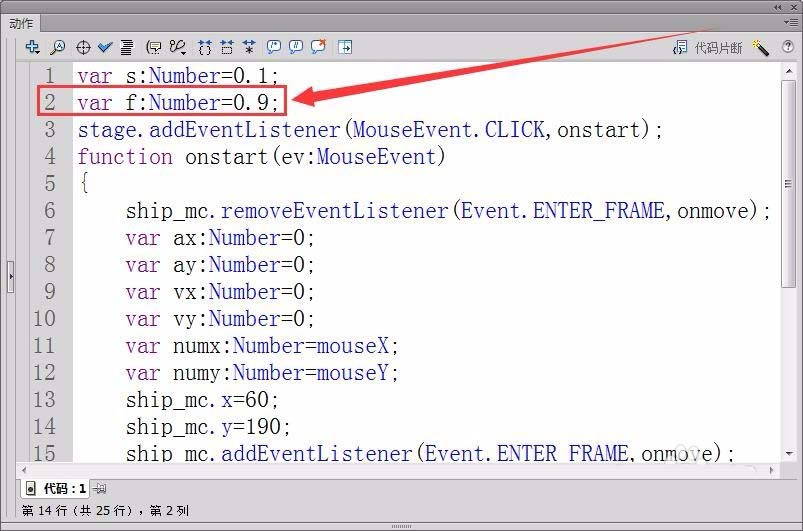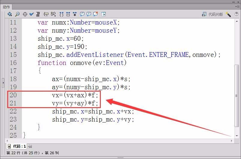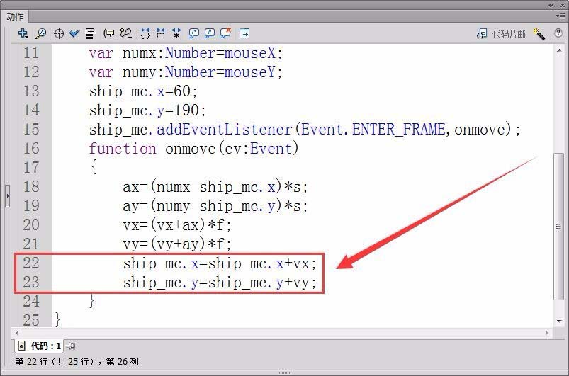 11、注册轮船影片剪辑元件ship_mc的enterframe事件的侦听器,用于控制轮船运动。