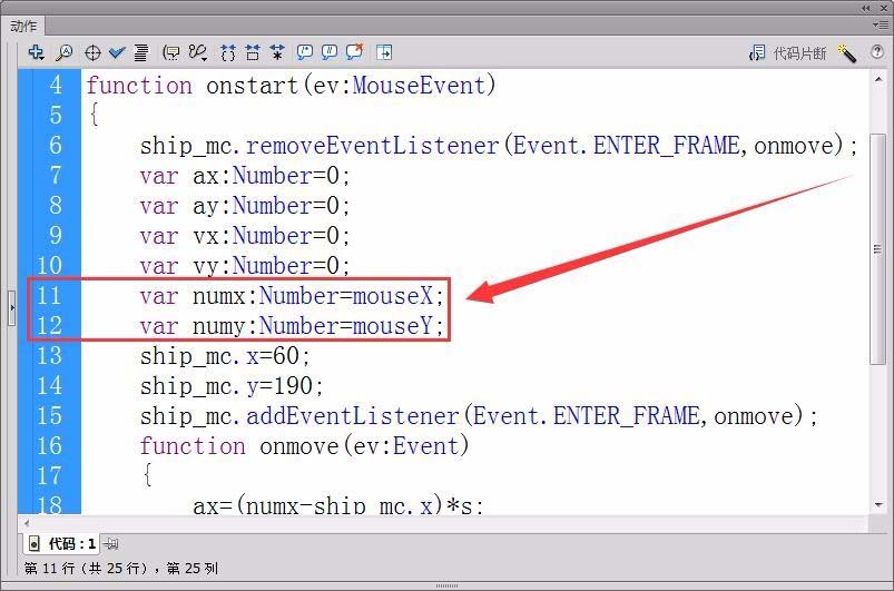 9、接着,定义两个变量numx和numy,用于保存鼠标的X轴和Y轴坐标值。