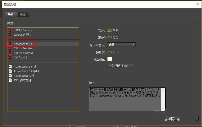 1、这里用的是Animate CC原名叫flash cc,打开软件,新建AS3文档。