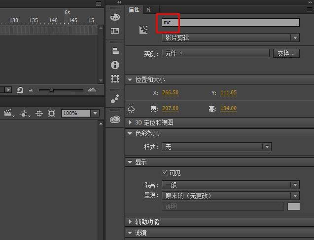 4、在主场景设置这个影片剪辑的实例名为mc