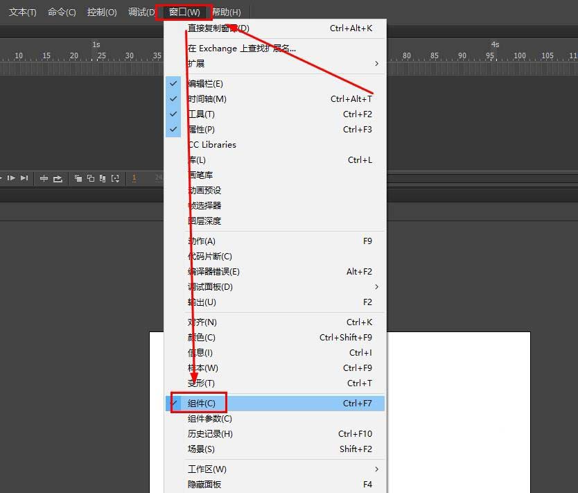 2、依次选择菜单栏--窗口--组件,打开组件面板。