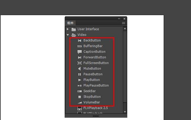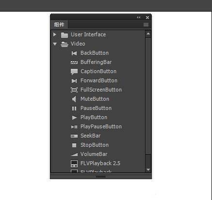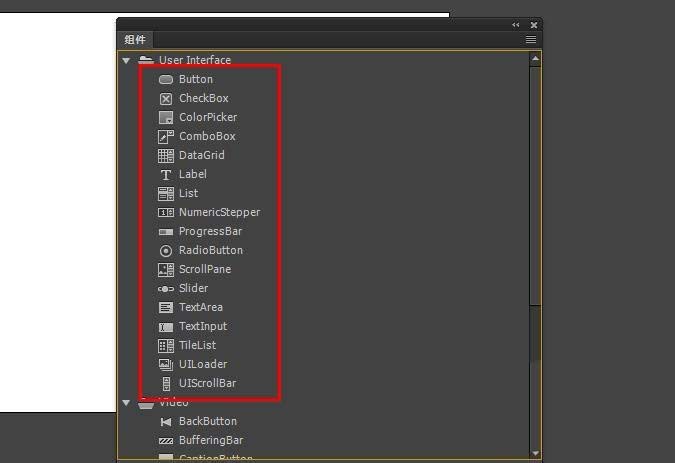 3、可以看到在Animate中,分成两个文件夹,一个是User Interface,主要是按钮、下拉条等常用组件,一个是Video是视频播放相关的组件,比以前版本不同的是,以前的视频播放组件没有单独的。