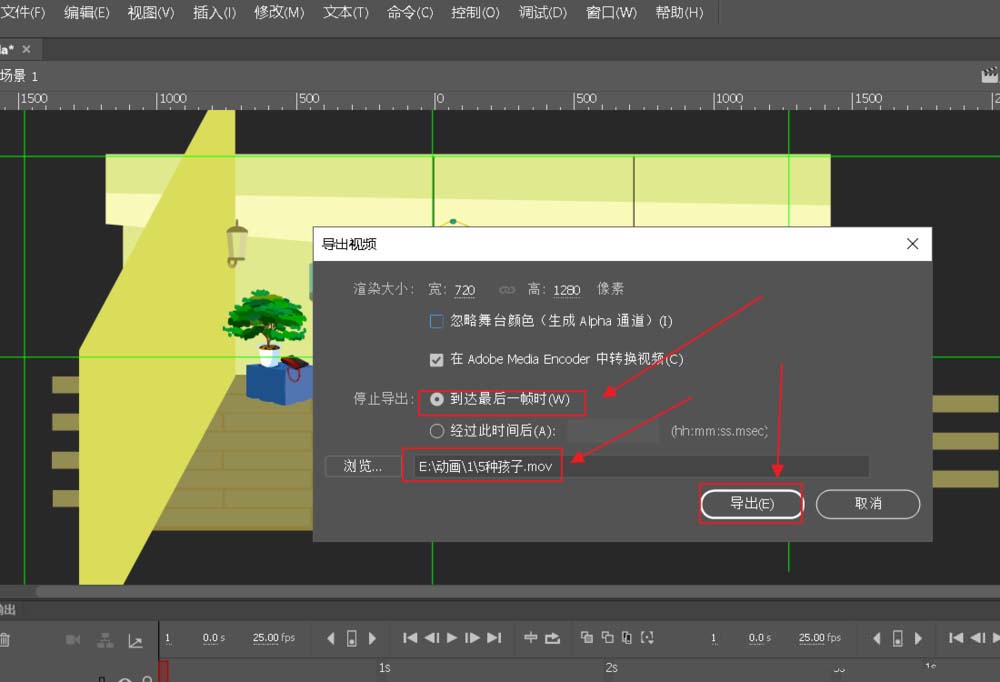 3、在导出视频的界面中,选择到达最后一帧时,选择存储的路径,点击导出。