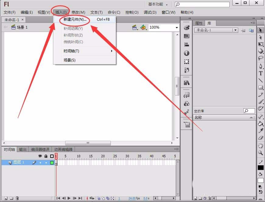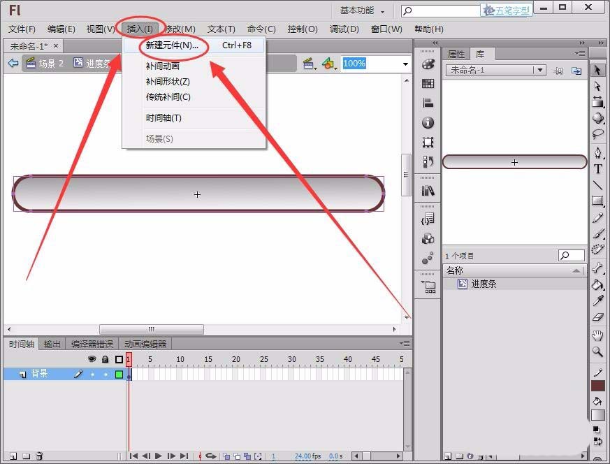 4、单击“插入”---->“新建元件”,创建一个影片剪辑元件“进度”。