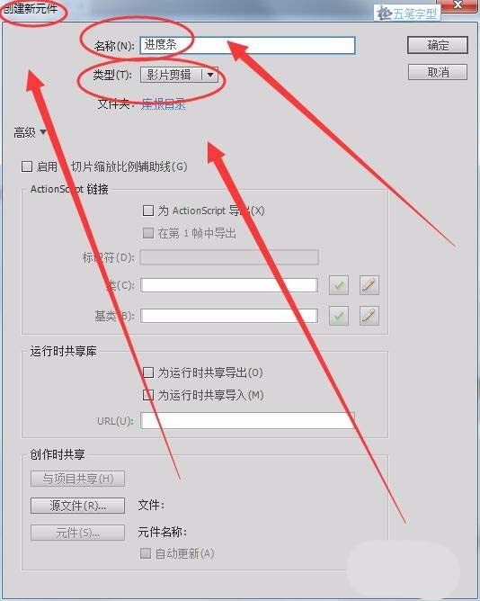 2、单击“插入”---->“新建元件”,在出现的“创建新元件”对话框中,将“名称”取名为“进度条”,“类型”为“影片剪辑”。