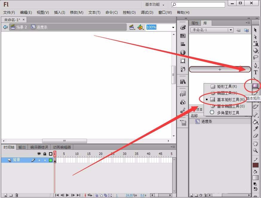3、在“编辑栏”中按住“矩形工具”不放,在出现的下拉菜单中,选择“基本矩形工具”,在“进度条”元件中,绘制一个圆头矩形。