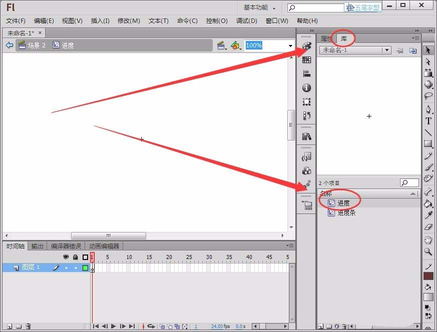 9、回到“场景1”,将“进度条”元件拖动到舞台上。