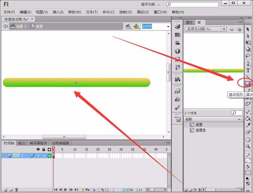 5、在“编辑栏”选择“基本矩形工具”,在图层的第1帧根据“进度条”的长度绘制一个圆头矩形。