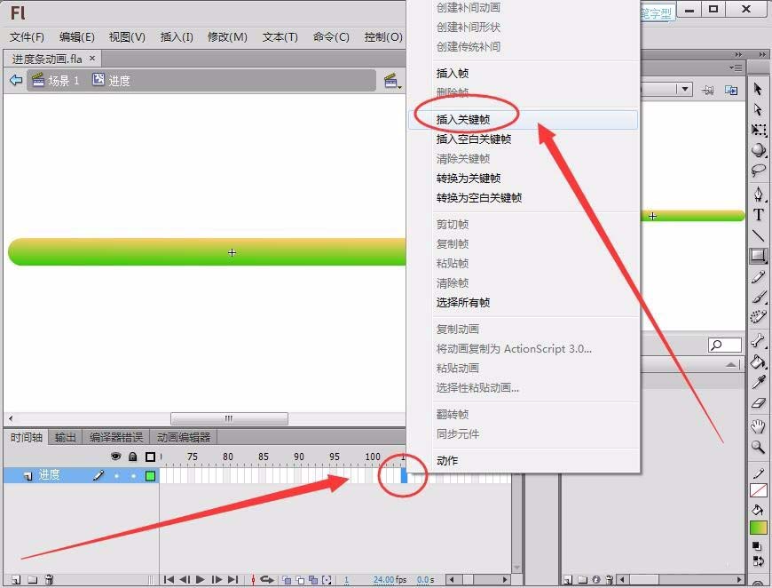 11、在“进度”图层的第100帧右击,选择“插入帧”,插入一个普通帧。用同样的方法在“进度条”图层的第100帧插入一个普通帧。