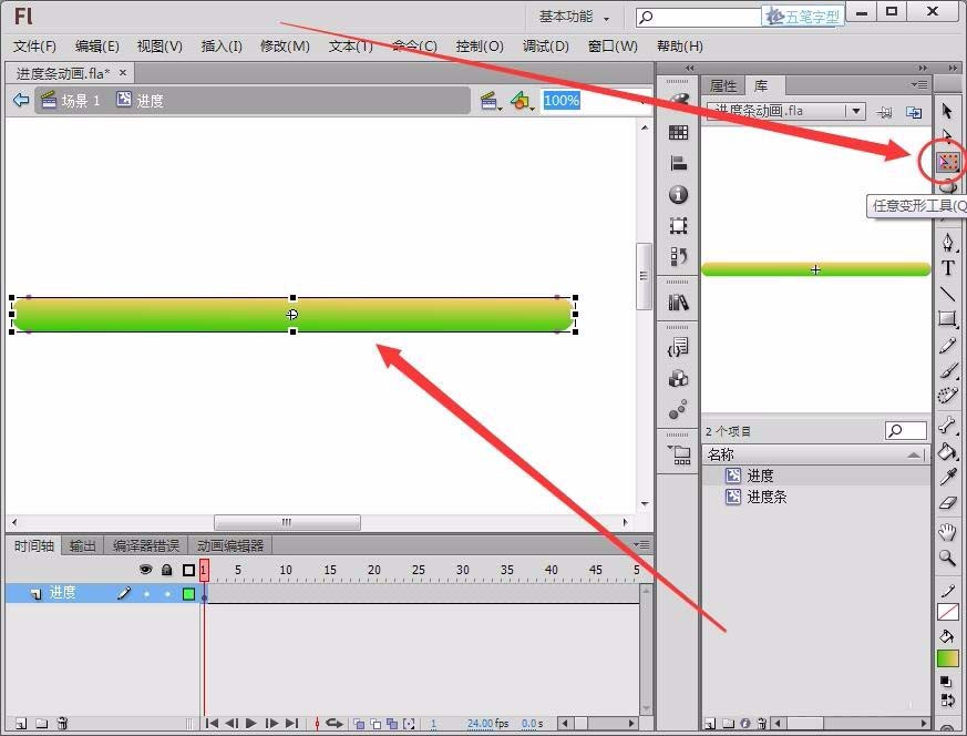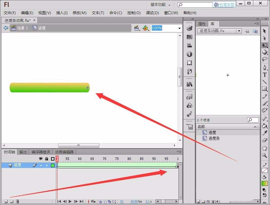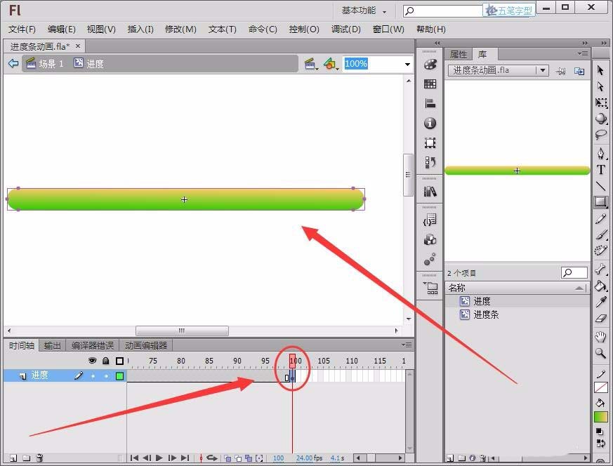 8、在第1帧与第100帧之间任意帧上右击,选择“创建补间形状”,我们在时间轴上可以看到一个箭头,“进度”元件就做好了。