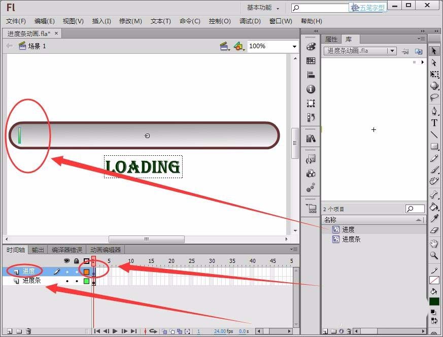 10、新建一个图层“进度”,将“进度”元件拖动到图层的第1帧。