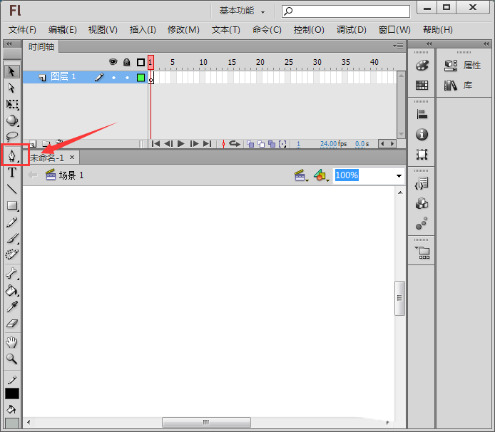 7、在flash的工具箱内找到颜料桶工具,将颜色设为红色,如图所示: