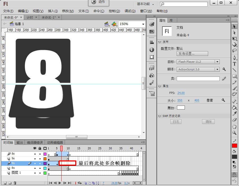9、到这里我们播放前10帧就已经实现了从数字9向数字8过渡的动画。其中1-5帧实现的是9的上半部分从上向下旋转到中间消失然后8的下半部分接差从中间向下旋转,整个过程连接起来就实现了我们想要的效果。最后要做的就是将9s层第6帧以后的帧删除,如图: