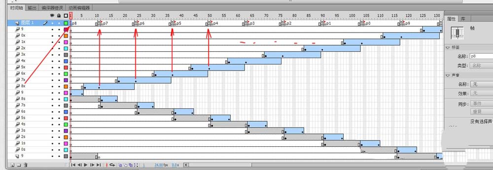 2、按上步的方法分别建立8s和8x两个层,并从图层1中将8s,8x两个影片剪辑分别ctrl+shift+v粘贴入8s和8x两个层中,并将各帧长度调整到如图所示!