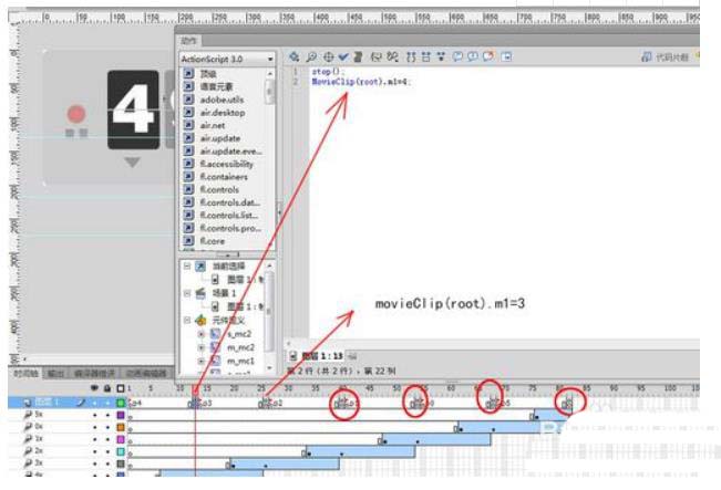 5、以同样的方法给m_mc1加入标签和代码,如图所示: