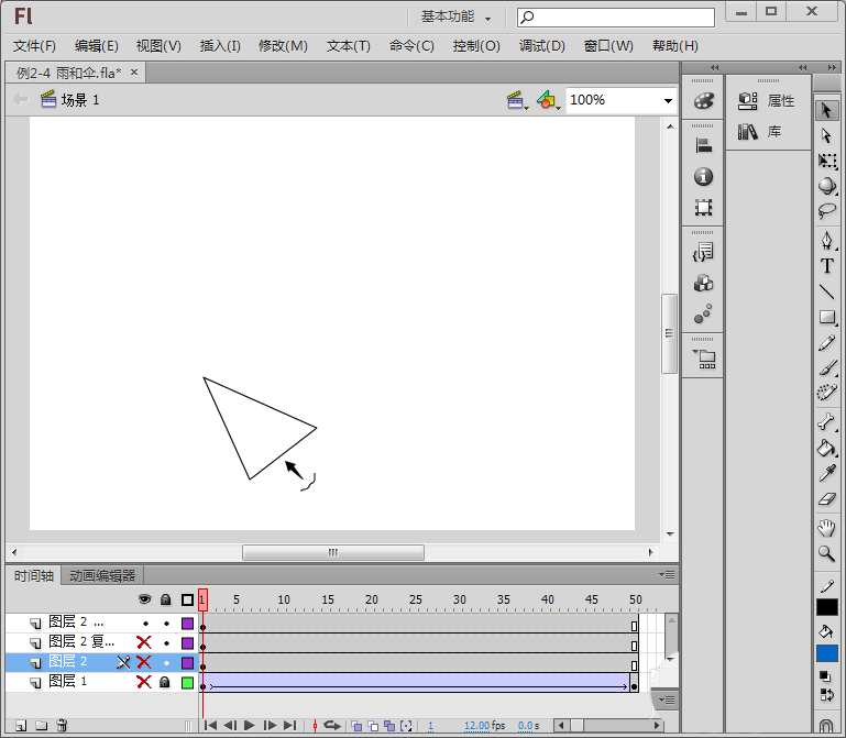 2、利用直线工具在舞台上画一个三角形。