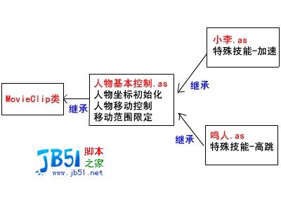 大家可以看到,“人物基本控制.as”类也是继承了MovieClip类,因为要用到MovieClip类里的功能嘛~比如人物移动要用到onEnterFrame,MC._x,MC._y这点功能。