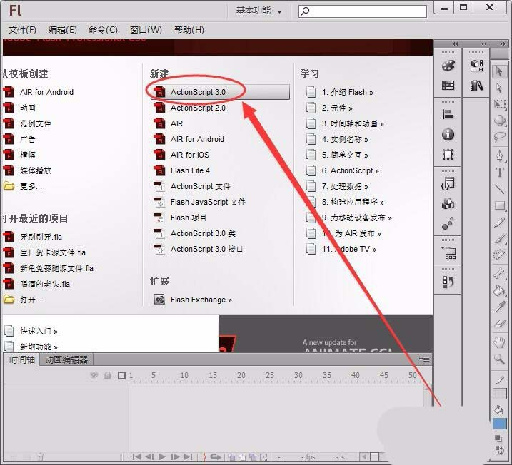 1、打开Flash软件,创建一个ActionScript3.0文档。