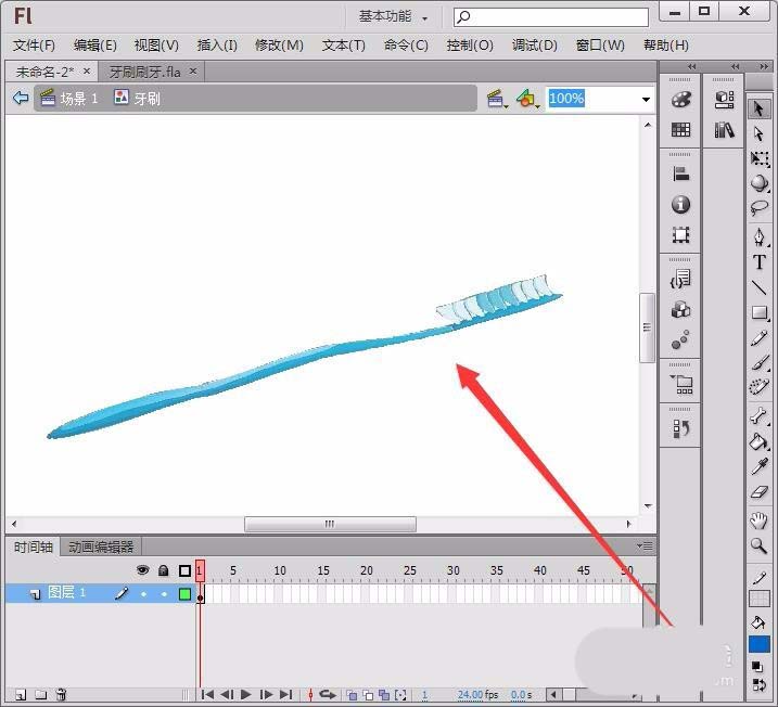 7、回到场景1,新建一个图层,在第一帧插入牙刷元件。