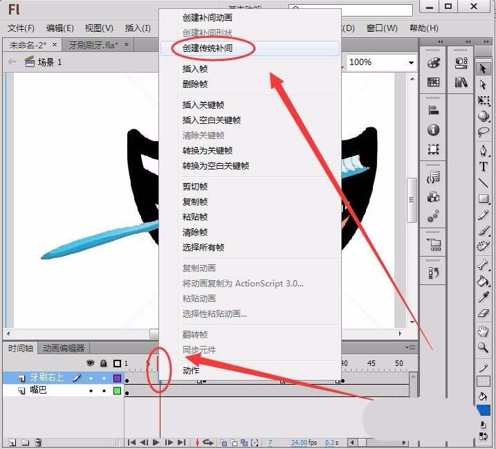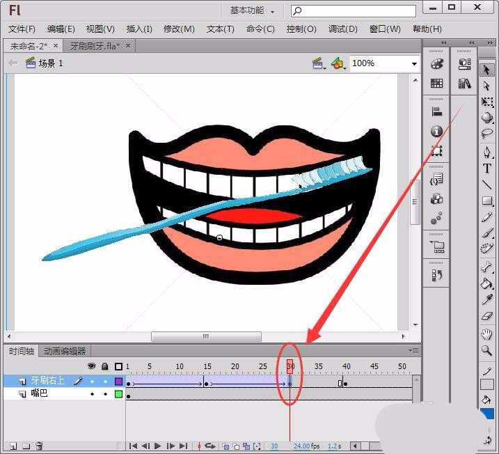 10、30帧处插入一个关键帧,将牙刷元件移回牙齿上部,并创建传统补间动画。