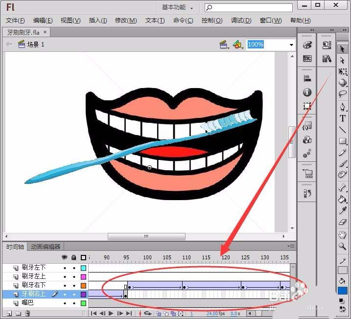 13、然后,创建3个图层,分别实现刷牙齿的右下、牙齿的左上和牙齿的左下动画。