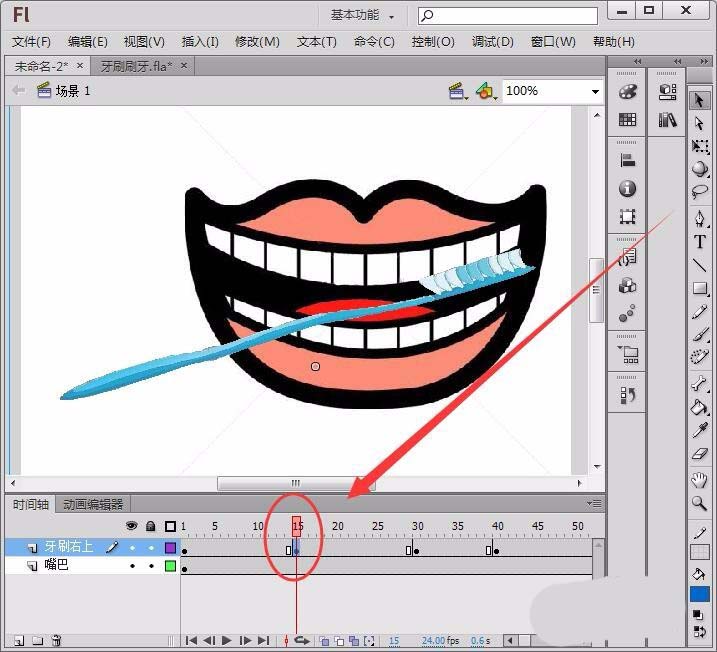 8、图层的第15帧处插入一个关键帧,将牙刷元件移到上排牙齿的下端。