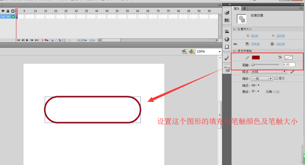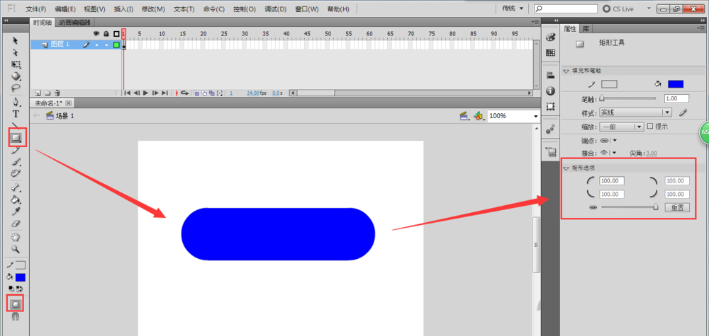 1、选择矩形工具,在矩形图形属性窗口中将矩形选项的圆角数值设置为最大,然后在舞台上绘制一个圆角矩形出来。