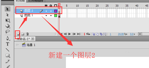 3、在时间轴中窗口的左下角位置找到新建图层按钮,单击新建图层按钮创建一个图层2出来。