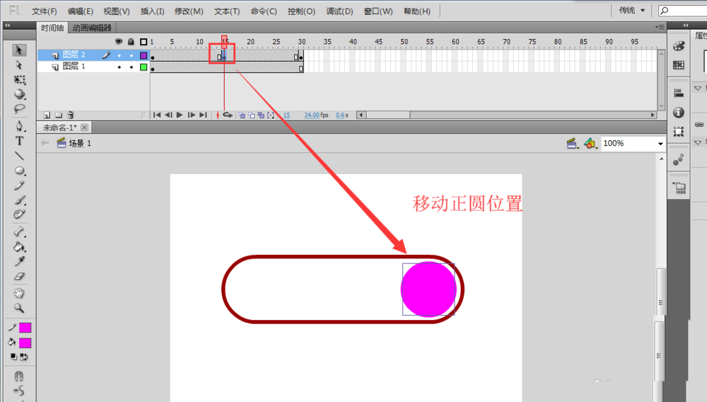 6、鼠标单击选中时间轴图层2图层的第15帧这个关键帧,然后用选择工具移动正圆,将正圆移动到右侧的位置。