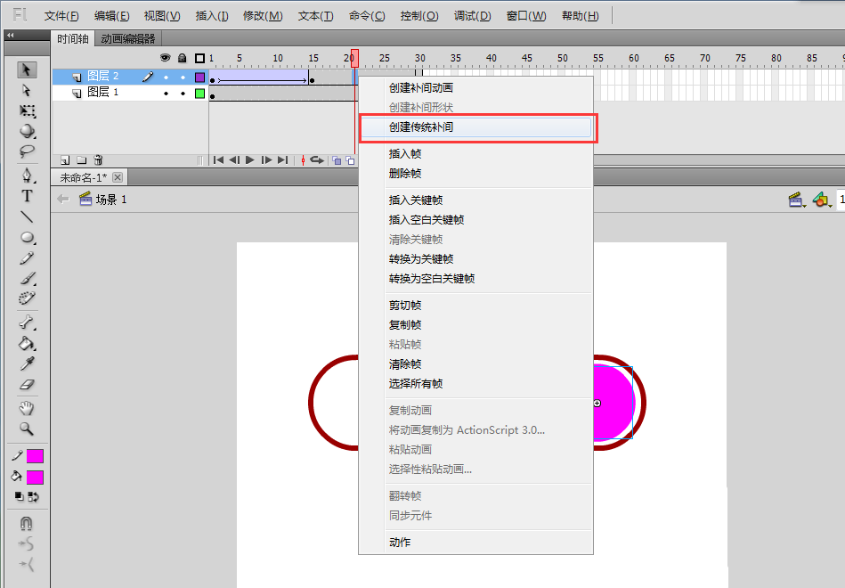 7、在图层2的第1到15帧与15到第30帧之间依次右键鼠标创建传统补间动画。然后按回车播放时间轴,会就呈现出动画效果。