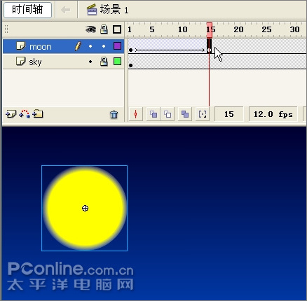 22、选择第1帧,将月亮垂直拖放到画布以外,完成月亮升起的动画。